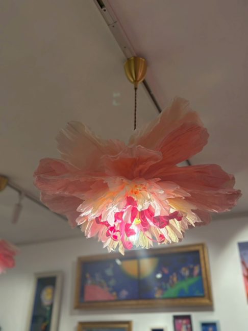 竹細工や和紙で大きなお花のオブジェを作るアーティスト砂田美紀子さんにオーダーしたピンクの繊細な照明。